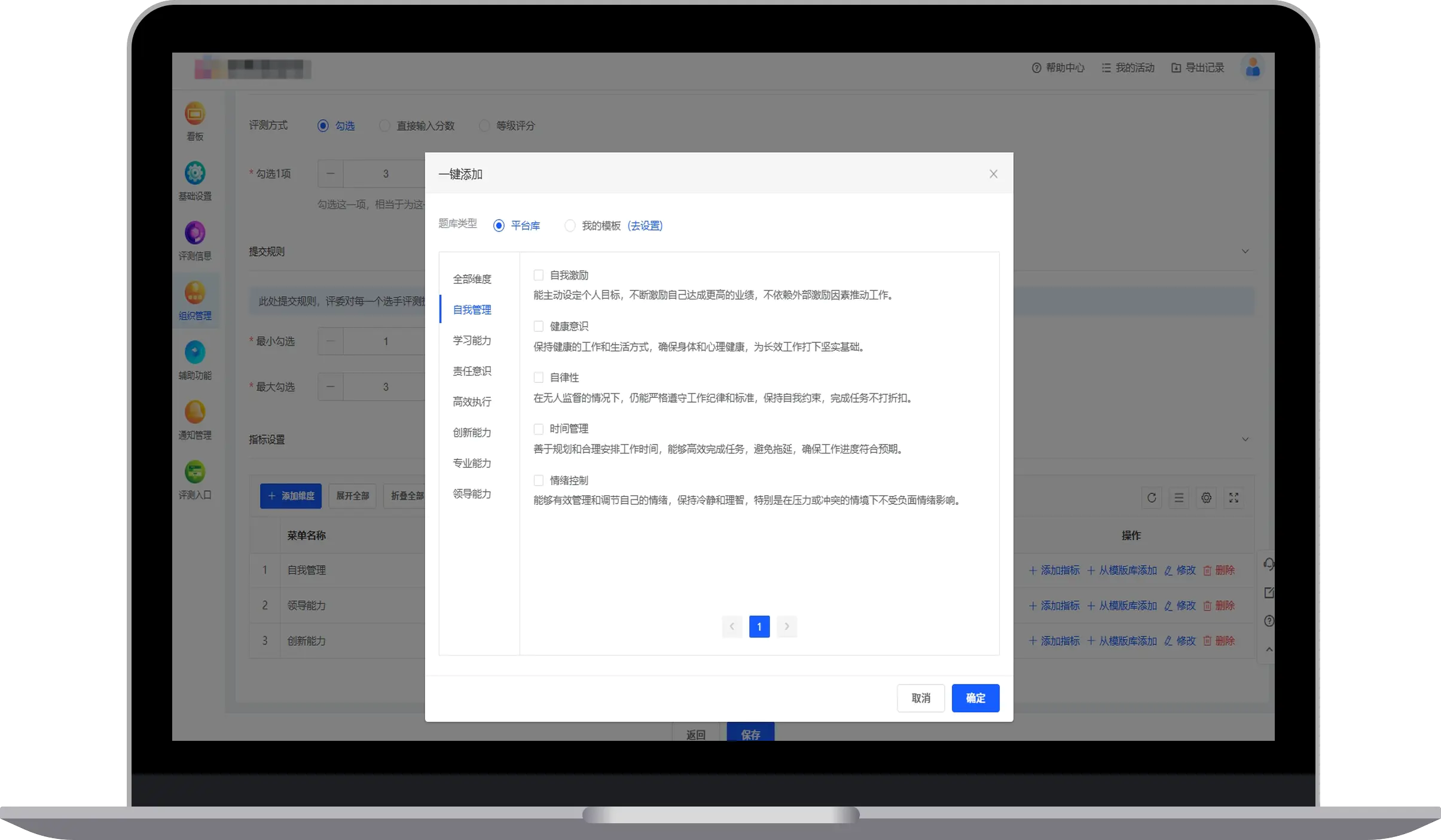 - 指标灵活配置:每个维度下可添加具体评估指标,支持定量和定性评价